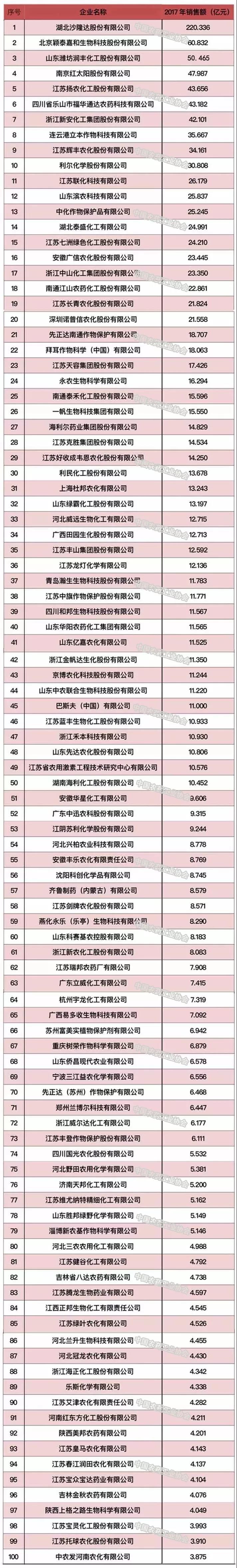 5月16日,2018中国农药行业销售百强企业榜单在“第五届农药行业经济运行分析会”上隆重发布并为获奖企业颁发了牌匾,湖北沙隆达股份有限公司以220.336亿元销售额摘得排行榜桂冠,是我国第1个农药主营业务销售额超百亿的企业。北京颖泰嘉和生物科技股份有限公司和山东潍坊润丰化工股份有限公司分别以60.832亿元和50.465亿元的业绩,摘得榜眼和探花之位。